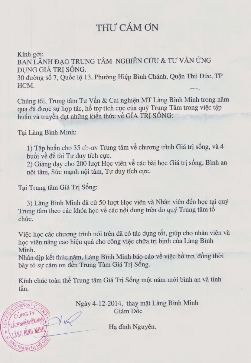 Thư cám ơn của Trung tâm Tư vấn & Cai nghiện MT Làng Bình Minh